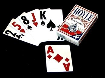 Hoyle Super Jumbo Playing Cards (Single Deck) - Low Vision Playing Cards. These cards feature 1" numerals, and black & red colors on white. Bridge size. # 48615